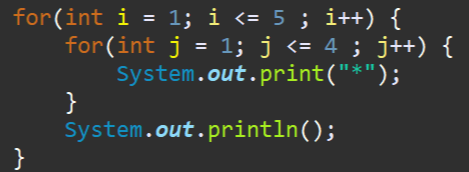 외부에 있는 for문은 5번 반복 되고, 내부에 있는 for문은 4번 반복이 되죠.
