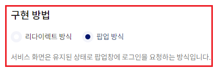 카카오 로그인을 리다이렉트 방식으로 할지, 팝업 방식으로 할지 설정. ( 팝업 )