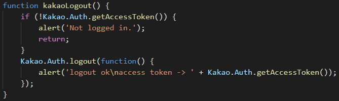 alert('logout ok\naccess token -> ' + Kakao.Auth.getAccessToken());