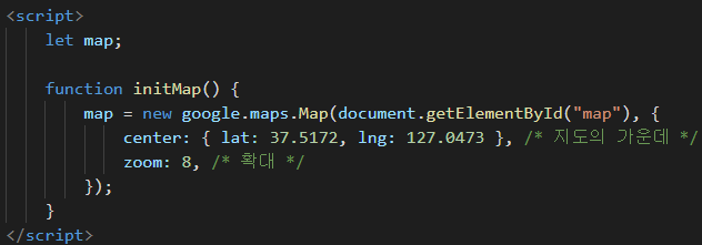 <script src="https://maps.googleapis.com/maps/api/js?key=인증키&callback=initMap&libraries=&v=weekly" async></script>
