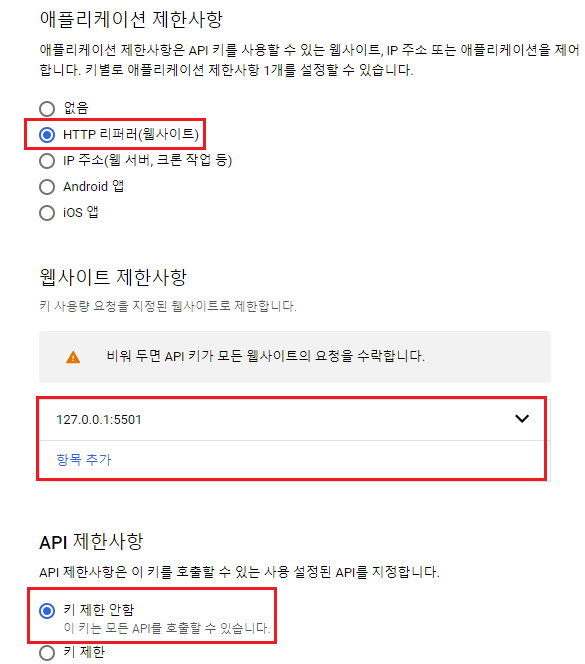 아래와 같이 설정을 해주세요 ( 웹사이트 제한사항에는 자신이 접속할 IP주소:포트번호 )