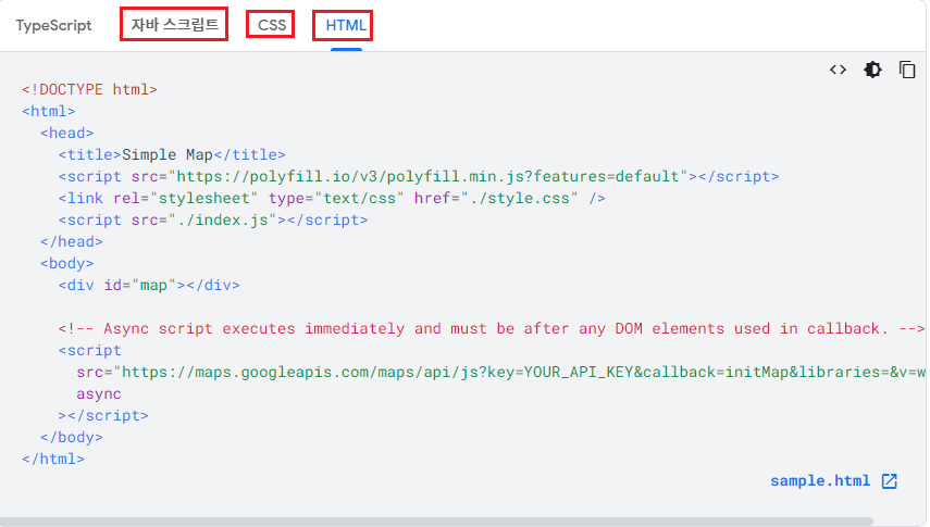 ※ 구글 맵을 해봤다면, 카카오 맵도 한번 해보세요. 카카오 맵은 샘플이 잘 나와 있습니다.