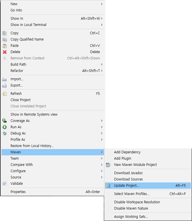 위의 코드를 넣었다면, 프로젝트 우클릭 -> "Maven" -> "Update Project" 클릭