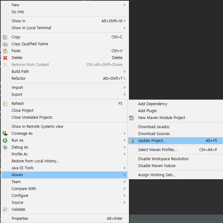 "pom.xml" 을 수정완료 했다면, 저장한 후에 프로젝트 우클릭을 한 후 업데이트 시켜 줍니다.