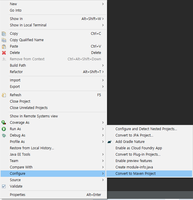 프로젝트가 완성 되었다면, 프로젝트의 우클릭 한 후에 아래처럼 Maven Project 로 변경합니다.