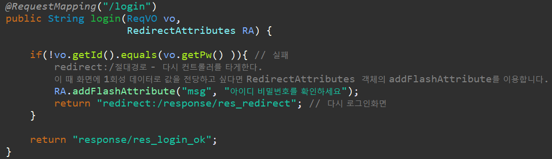 보통, redirect 는 컨트롤러 -> 컨트롤러 로 이동할 때 사용하게 되고, 이동할 경로 앞에 "redirect:/" 를 붙입니다.