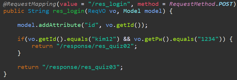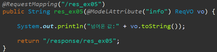 @ModelAttribute 는 단일 값만 받고, 넘기고 할 수 있는데, 여러개의 값을 넘기고 싶다면, VO 객체 ( 여러개의 멤버변수를 가진 ) 를 만들어서 사용 합니다.