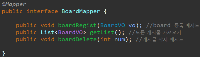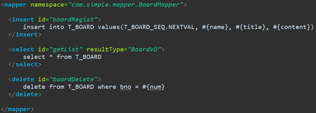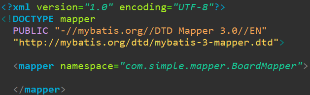 위에서 만든 BoardMapper(Interface) 를 BoardMapper.xml 에 매핑시켜 줍니다. 아래는 "BoardMapper.xml" 파일