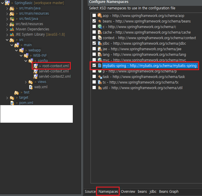 "root-context.xml" 파일로 이동해서 아래의 설정 및 코드를 추가 합니다.