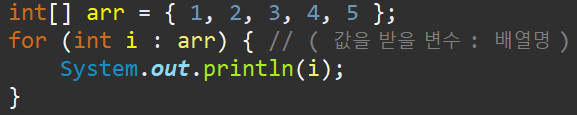 for ( 배열의 값을 담을 변수 : 배열의 변수이름 ) {