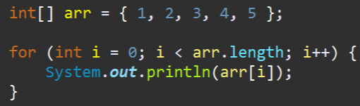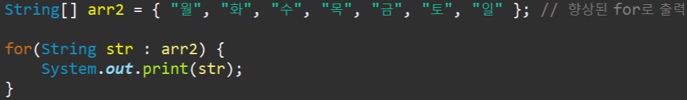 그런데, 향상된 for문은 배열명을 넣으면, 알아서 배열의 길이만큼 반복을 해주고, index를 고려할 필요 없이 앞에 선언한 변수에 값이 알아서 들어갑니다.