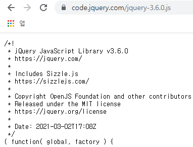 그러면, 아래와 같은 경로의 새 창이 열리면서, Jquery.js 의 내용들이 나타나게 됩니다.