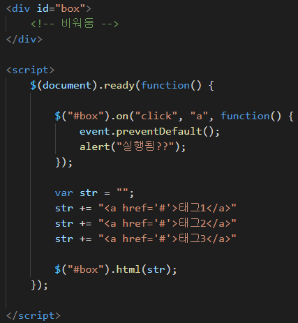 즉, on 함수를 쓸 때는 <div id="box"> 에 <a> 태그가 없습니다.