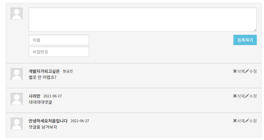 | Day93 - [Jquery]댓글 수정, 삭제, 더보기 (0) | 2021.06.29 |