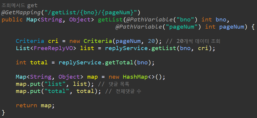 이렇게 하고, 컨트롤러 에서는 아래처럼 만들어 줍니다 ( getTotal 은 전체 댓글 수 입니다 )