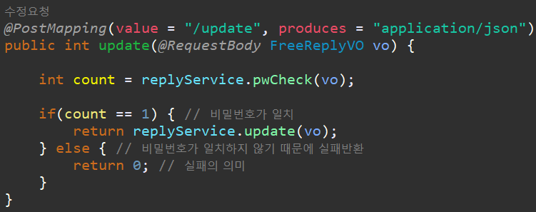 비동기 서버인 REST API ( 컨트롤러 ) 에서는, 댓글번호 와 비밀번호를 비교하는 메서드를 실행한 뒤, 비밀번호가 맞다면 수정하는 update 메서드를 실행 합니다.