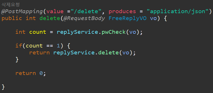 비밀번호를 입력한 후 삭제하기를 누르면, 컨트롤러 에서 댓글번호 와 비밀번호를 확인한 후, 댓글을 삭제 합니다.