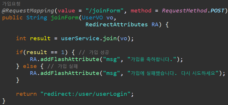 이렇게 하면, 회원가입을 완료하게 되었습니다. 로그인 화면에서는 "msg" 를 전달 받아서, 회원가입에 성공, 실패 여부를 화면에 표시해 줍니다.