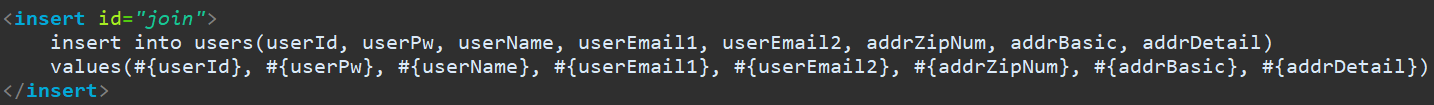 Mapper.xml 에서 SQL 문을 이용해서 값을 insert 합니다.