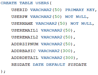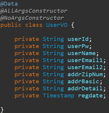 먼저 회원가입Form 에서 넘어올 데이터 들에 대한 데이터베이스 및 그에 상응 하는 UserVO 를 만듭니다.