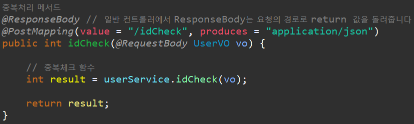 아이디가 이미 있다면 1을 반환, 없다면 0을 반환 하게 됩니다