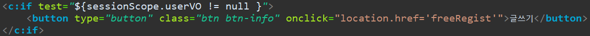 이제, 화면에서 "userVO" 라는 이름의 세션을 가지고 있지 않다면, 접근 불가 or 특정 기능을 사용 못하도록 만들어 줍시다.
