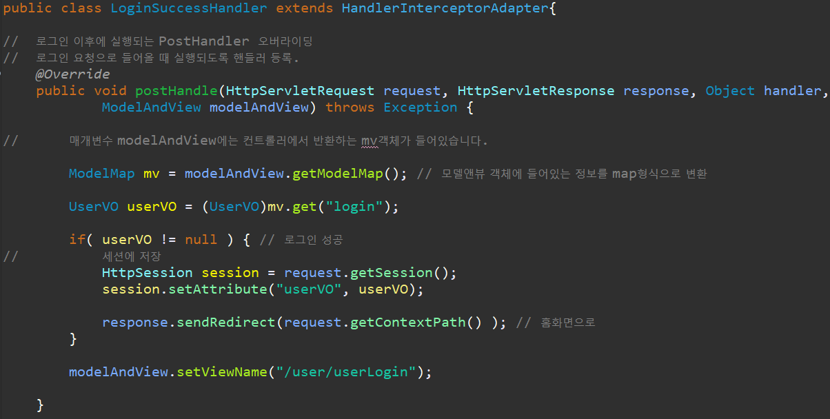 사실 위에서 로그인을 하고 난 후에, 로그인에 성공하면 컨트롤러 에서 세션을 만들어 주었습니다. 하지만, 아래처럼 "PostHandle" 을 이용해서 로그인을 성공하면 세션을 만들어 줘도 됩니다.