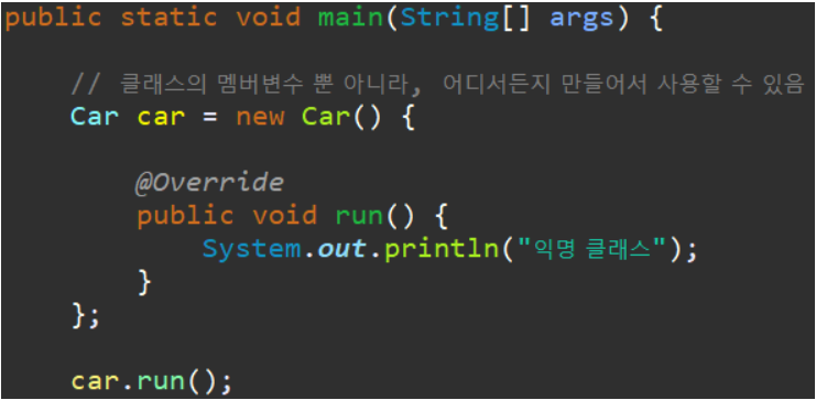위의 예시 처럼, 인터페이스를 바로 구현화해서 사용하는 것을 익명 객체(클래스) 라고 한다.