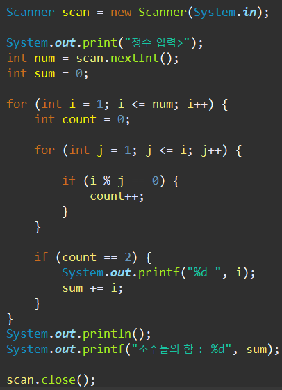 그러면 소수가 아니라고 판명이 될 경우에는 continue를 써서 외부 for문으로 돌아가면 되겠네요?