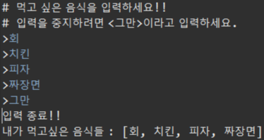 반복문 안에서 "그만" 이 입력 될 때까지 반복을 시켜줍니다