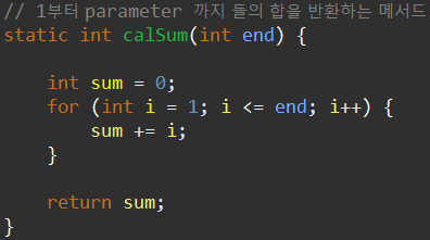 저는 1부터 시작해서 원하는 수까지의 합을 반환해주는 메서드를 만들어 주고 싶어요