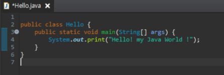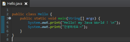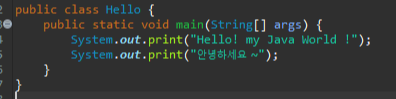 System.out 이라는 코드는 잘 모르겠지만 , print("Hello! my Java World !"); 라는 코드를 사용했더니 "" 안에 있는 문자열이 출력이 되었죠 . System.out.print(args); () 안에 있는 문자 또는 숫자 등등 을 출력하는 매서드(함수) 입니다.