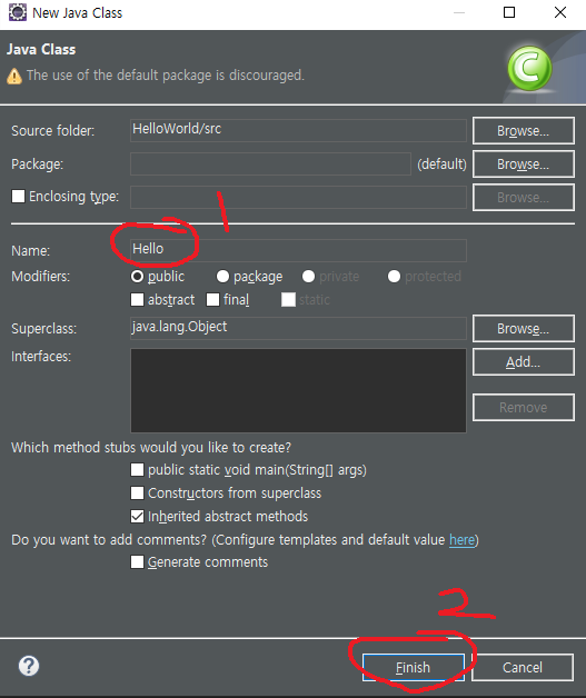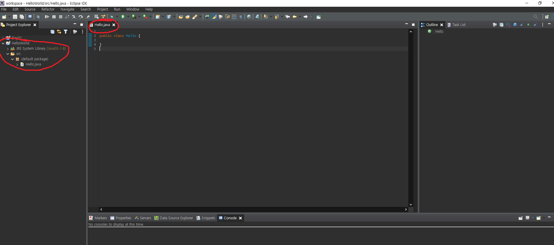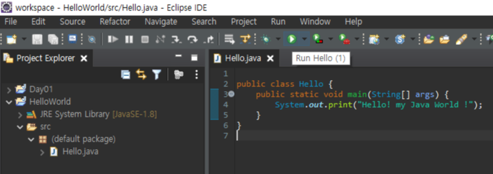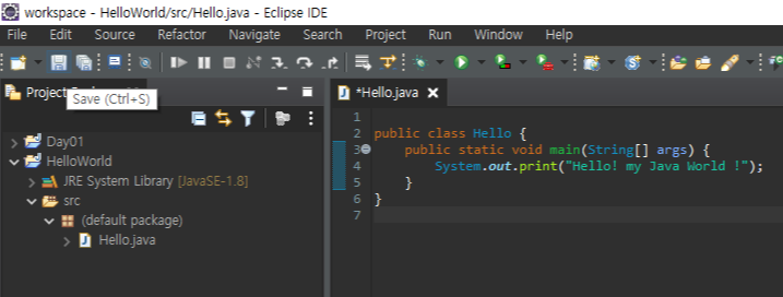 보시면 좌측에 src 폴더 밑으로 default package 밑으로 Hello.java 라는 파일이 생긴것을 확인 할 수 있고,
