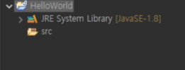 그러면 좌측에 화면과 같이 HellowWorld 라는 폴더가 생성이 되었고, 그 밑으로 JRE System Library, src 폴더가 생성이 된 것이 확인이 되죠. 라이브러리는 JAVA에서 자주쓰는 함수들을 포함하고 있는 것들이라고 생각하면 됩니다 ~