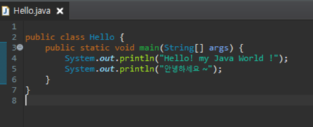 가운데 보시면 Hello.java라는 파일에는 public class Hello{} 라고 되어 있는게 확인이 됩니다.