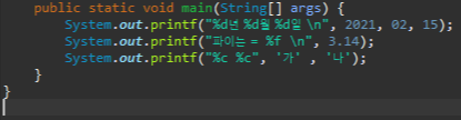 이 외에도 printf라는 게 있는데 , 이 매서드는 중간에 정수 , 실수 , 단일문자 등등 을 표현할 수 있습니다.