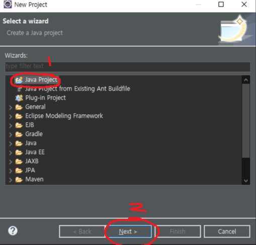 그 다음엔 화면과 같이 이런 화면이 나오는데, 여기서는 Java Project를 클릭해주고 Next를 눌러줍니다