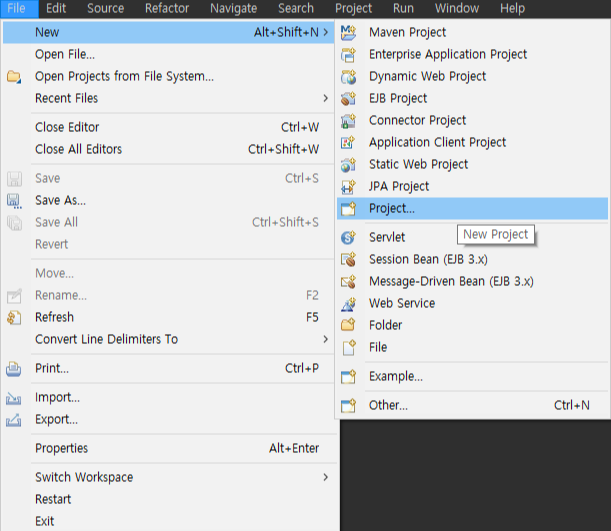 이클립스 상단에 File - New - Project... 를 클릭해 줍시다