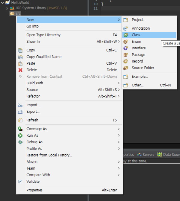 이제 src 폴더에 우클릭을 하고 New - Class 를 클릭해줍니다.