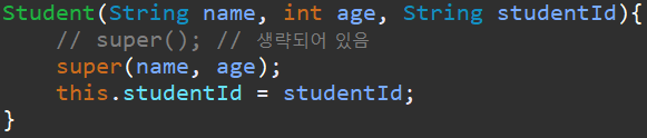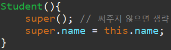 Student 객체가 만들어지면, Student() 생성자를 실행하고, 그 안에서 super() -> 부모클래스 생성자 를 실행하는 겁니다.