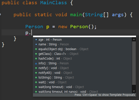 상속을 받지 않는 Person 클래스인데, p 에 . 을 찍으니까 사용할 수 있는 메서드 들이 많이 나오죠?