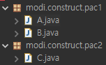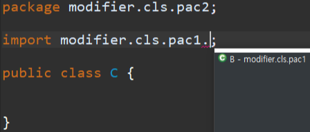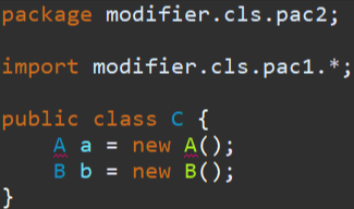 그래서 이렇게 default 인 A는 다른 패키지에 있는 C에서는 사용할 수 없고, public 인 B 는 사용할 수 있는 겁니다