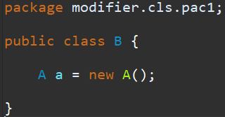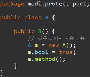 이 A 클래스는 같은 패키지에 있는 B 클래스에서 사용이 가능합니다. 확인을 해보죠