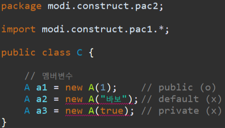 C 클래스에서는 public 생성자만 사용이 가능하고 default와 private 생성자는 사용이 불가능하네요