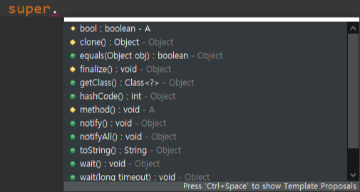 이렇게 super 를 이용해서 protected 된 멤버변수, 생성자, 메서드를 사용할 수 있는데, super 를 사용해보시면 최상위 클래스 Object 에 protected 되어 있는 것도 확인이 되실 겁니다.