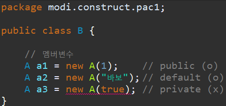 각각의 A클래스의 객체를 만들면서 생성자를 호출하는데, private 생성자만 오류가 뜨는걸 확인 할 수 있습니다.
