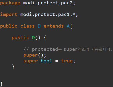 다른 패키지에 있는 D 클래스에 상속을 받아 사용해 봅시다.