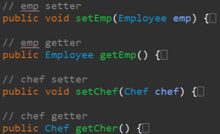 private 로 선언된 직원과 셰프들을 사용하기 위해 setter,getter 를 만들어 줍니다.