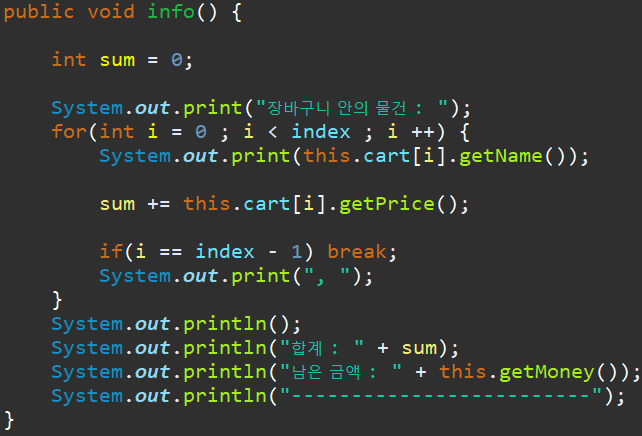 - info() 는 장바구니 안에 담긴 물건의 이름을 출력. 장바구니 안의 물건 총 가격 , 남은 금액 출력