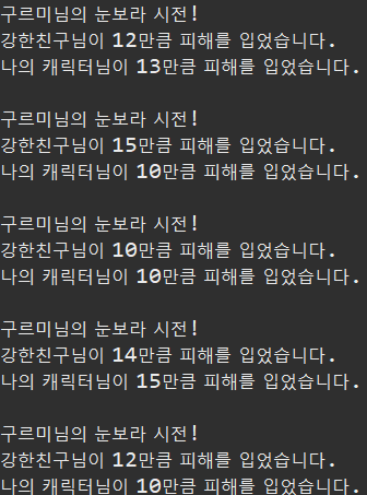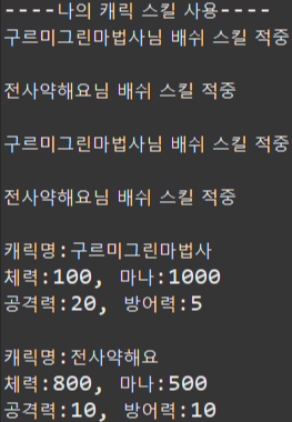 - 다른 공격할 캐릭터를 매개변수로 넣고, hp를 깎은 후 출력해라